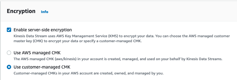 The encryption in transit is enabled by default by AWS. Encryption at rest of particular records can be configured using KMS key. There are two options – AWS managed CMK or Customer-managed CMK.
