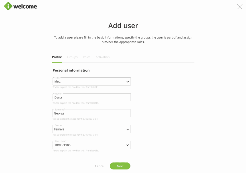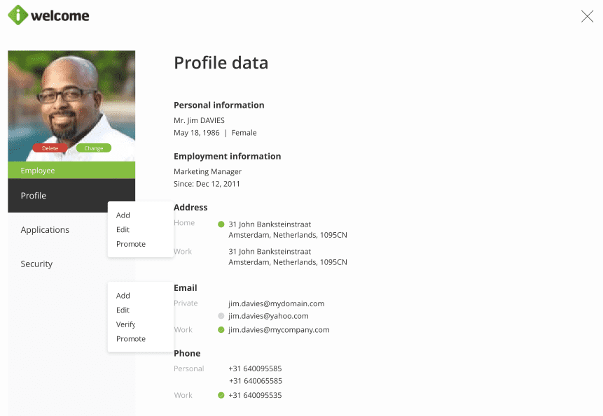 In addition to allowing you to add and manage users, the platform also allows administrators to manage users' personal data (such as profile picture, name, age, gender, address and phone, etc.) as well as employment information. You can add new information, edit the existing one or promote (move upward) the existing sections.