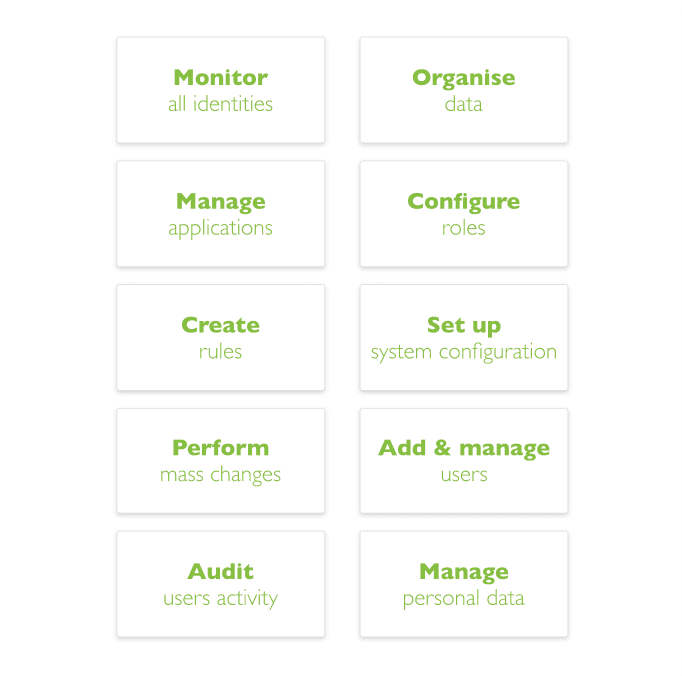 The information presented includes information regarding data visualisation and setup actions (data, access, customisation, settings), but doesn't include actions performed on specific identities in service desk.