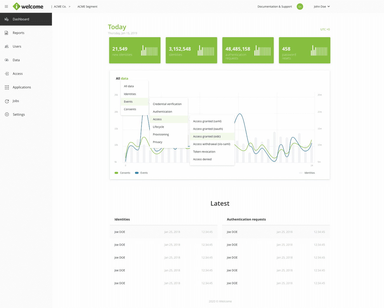 Monitor the identity-related events of your choice for up to one year back, through the platform's customisable data visualisation tools such as Dashboards and Reports.
