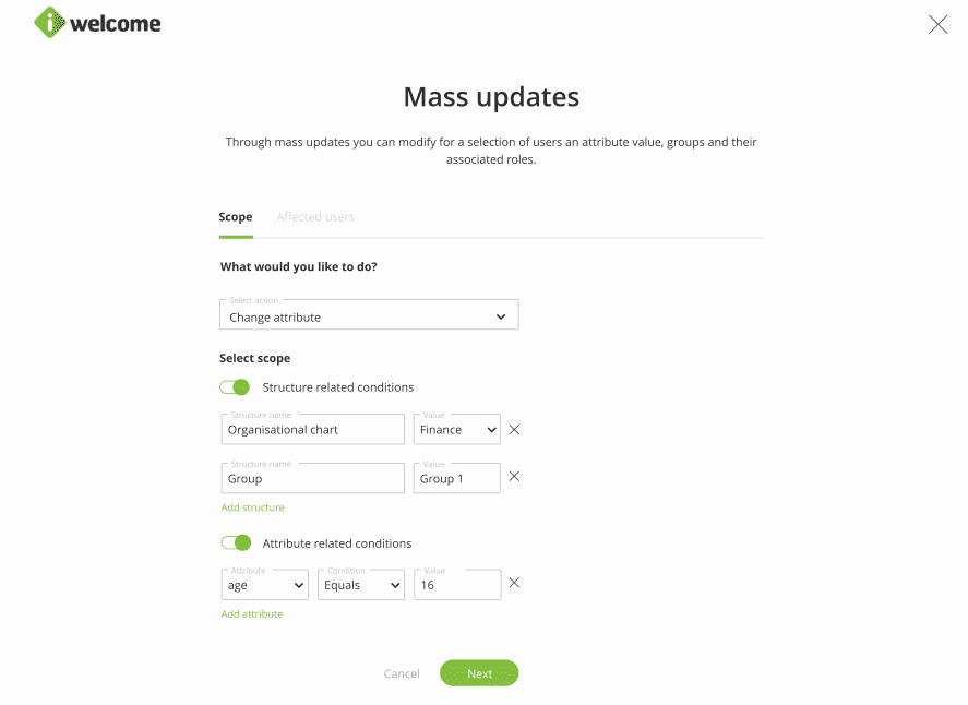 Within the platform, we provide mass changes as a quick way for you to assign, as a one-time action, roles to a large number of identities at once. This assignment is performed if they have a certain set of attributes or if they belong to a certain group.