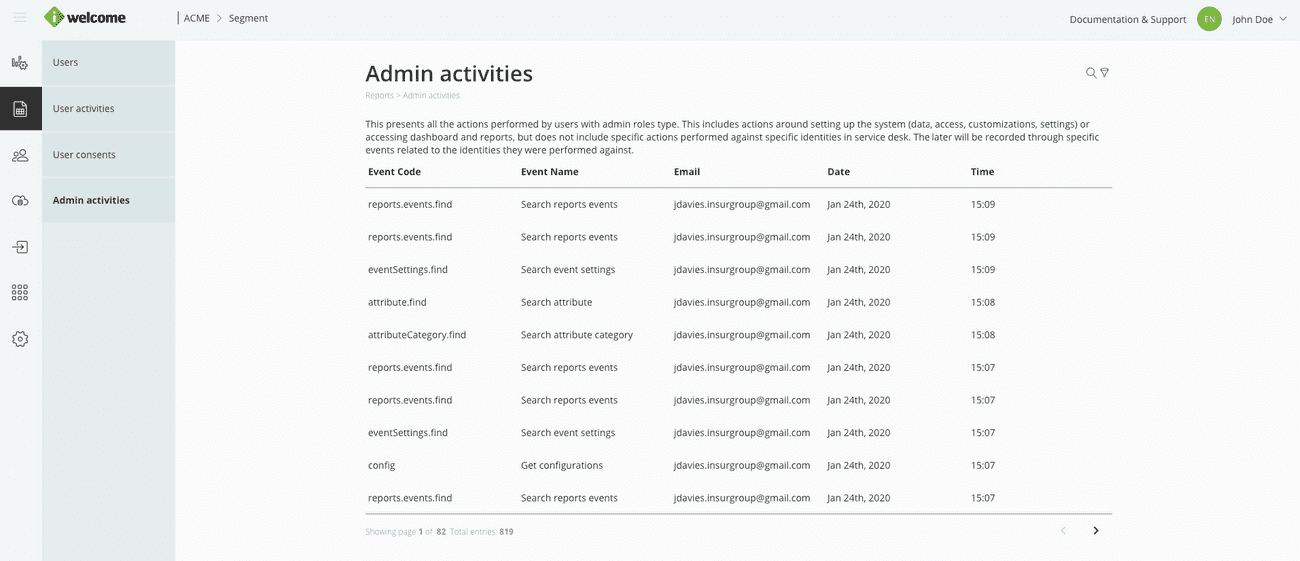 Stay on top of what is going on in the platform with the help of the Activity tab, which presents all actions performed by users with admin role types.