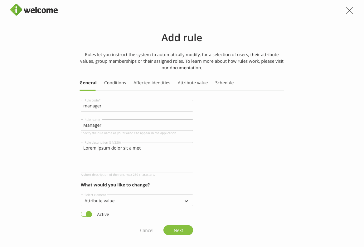 A rule instructs the system to perform a certain action if the set conditions are met. Conditions may be related to an identity belonging to a specific group, or if it has a certain value for one or more attributes.