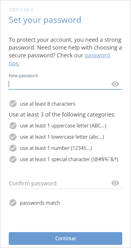 When the user chooses a new password, they must retype the password in the confirm password field. This confirm password field can be removed on your request. User passwords can be validated against your company’s password policy. We recommend a password policy that includes the following requirements: