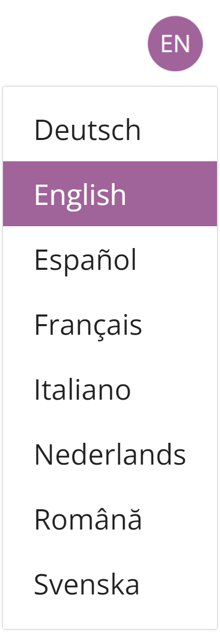 Users can switch between languages by clicking the language icon, which shows a dropdown list with the available languages. The language currently active is indicated in the icon by its two-letter code (ISO 639-1). The font, size and shape of the language icon is fixed, but the background colour can be customised.