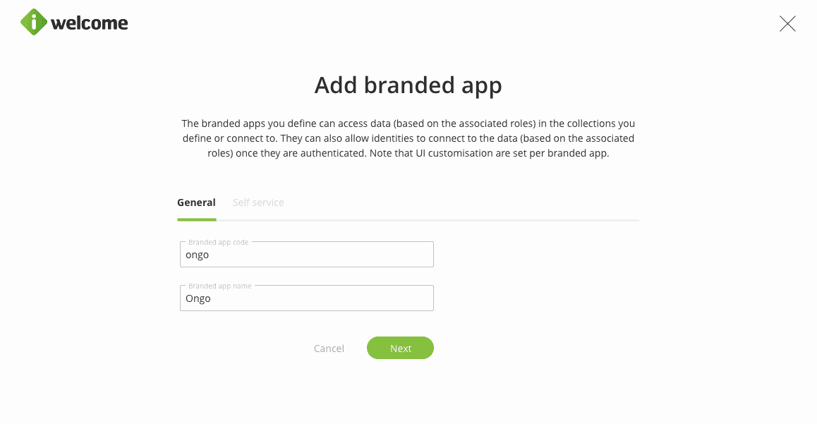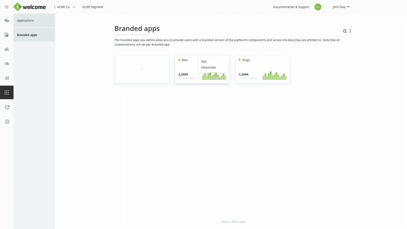 Branded apps represent the applications that the organisation owns and controls and whose identities are managed through OneWelcome IAM. For each such application the system generates a unique application URL (with several sub-domains to cater for different services and ways to access, such as self service, portal and API).