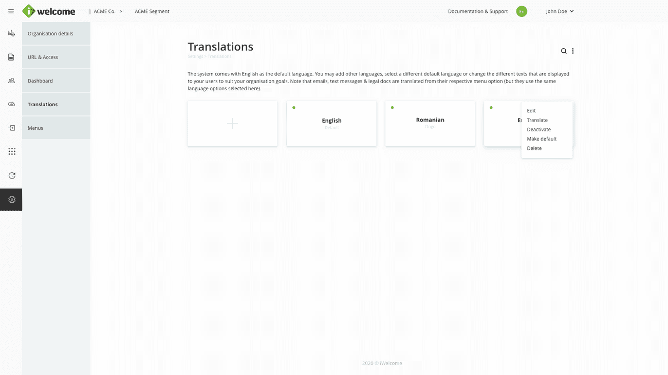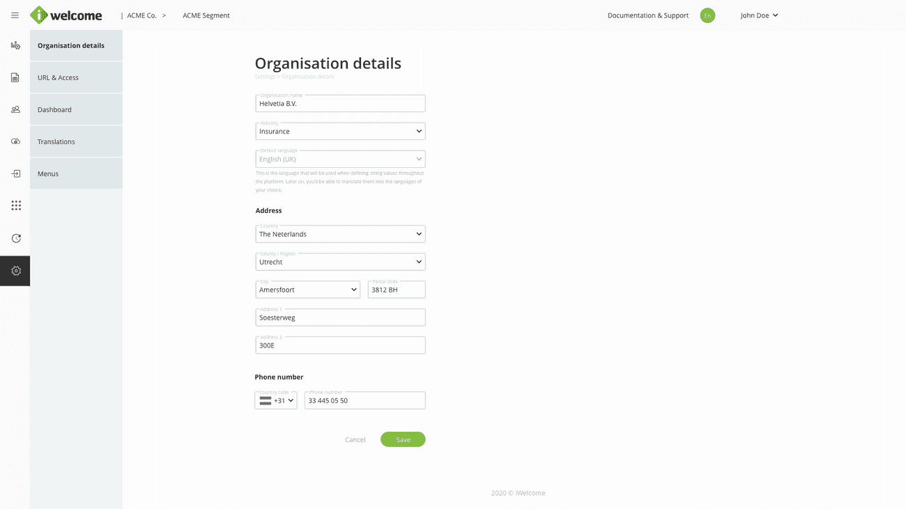 Please define your organisation data. Pay special attention to the default language setting under the General tab as any content you will define going forward will be associated to this language. Later on, you'll be able to add different other languages and translate or adjust the tone to fit your organisational culture.