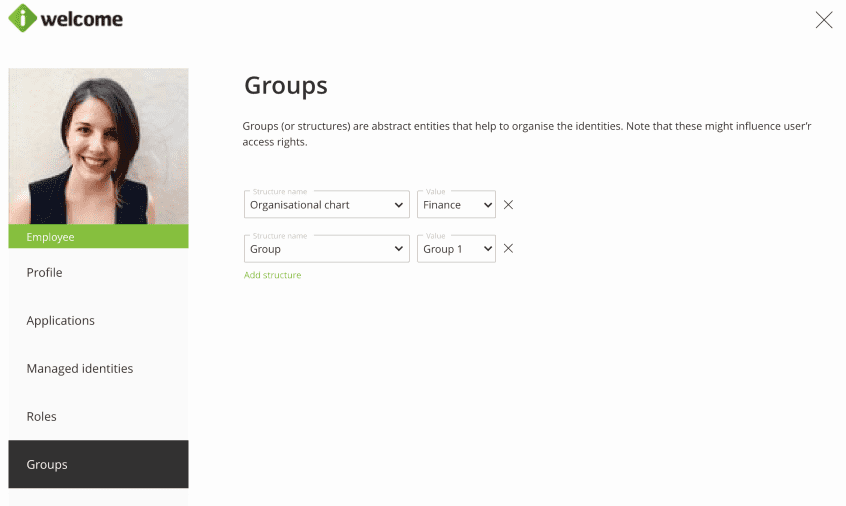 - Static structures. These are groups that the organisation defined manually. Additionally, identities will have to be associated to the groups defined under these types of structures by an organisation user (employee, partner, etc.) with the proper access rights. The system provides ways to automate this step through different sets of rules and mass updates.