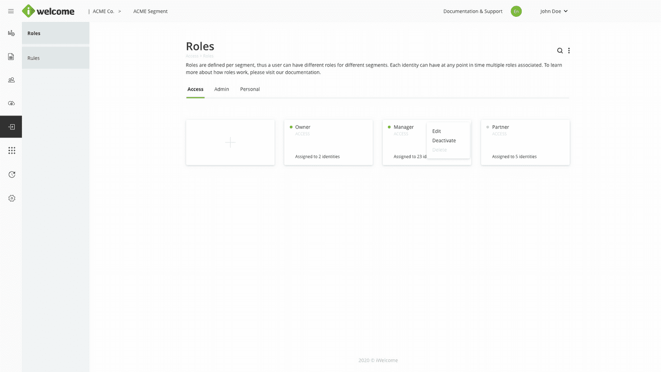 Roles and their associated entitlements are at the core of the OneWelcome RITM platform. The platform provides three types of roles: