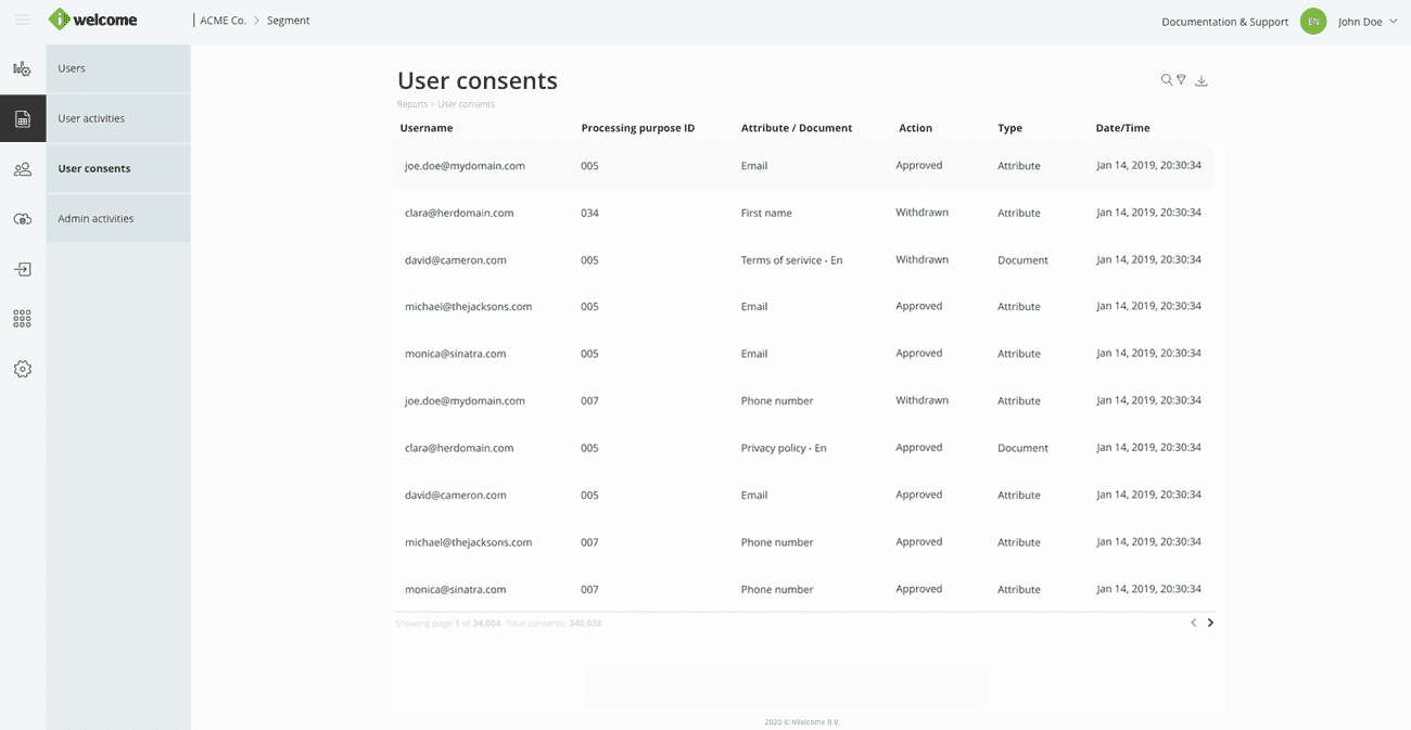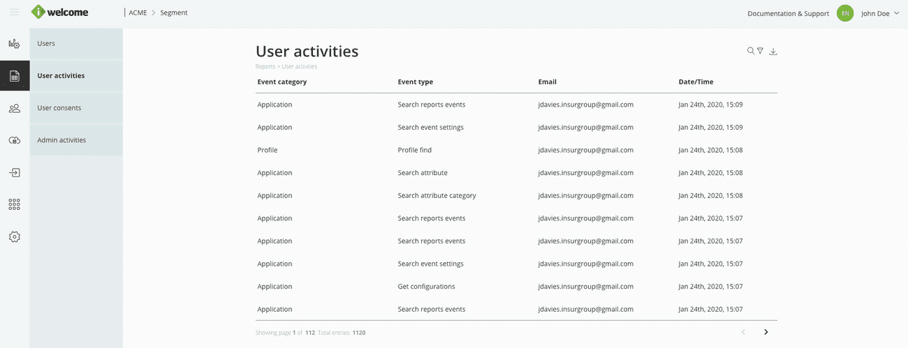 Reports take the data presented in your dashboard even further by providing detailed information on activity related to Identities, Events and Consents.