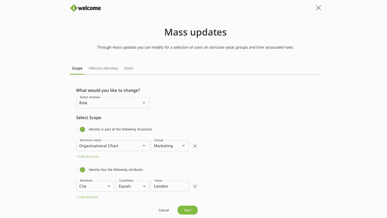 - Mass updates. Allow you to apply role, group or attribute value changes for a selection of users