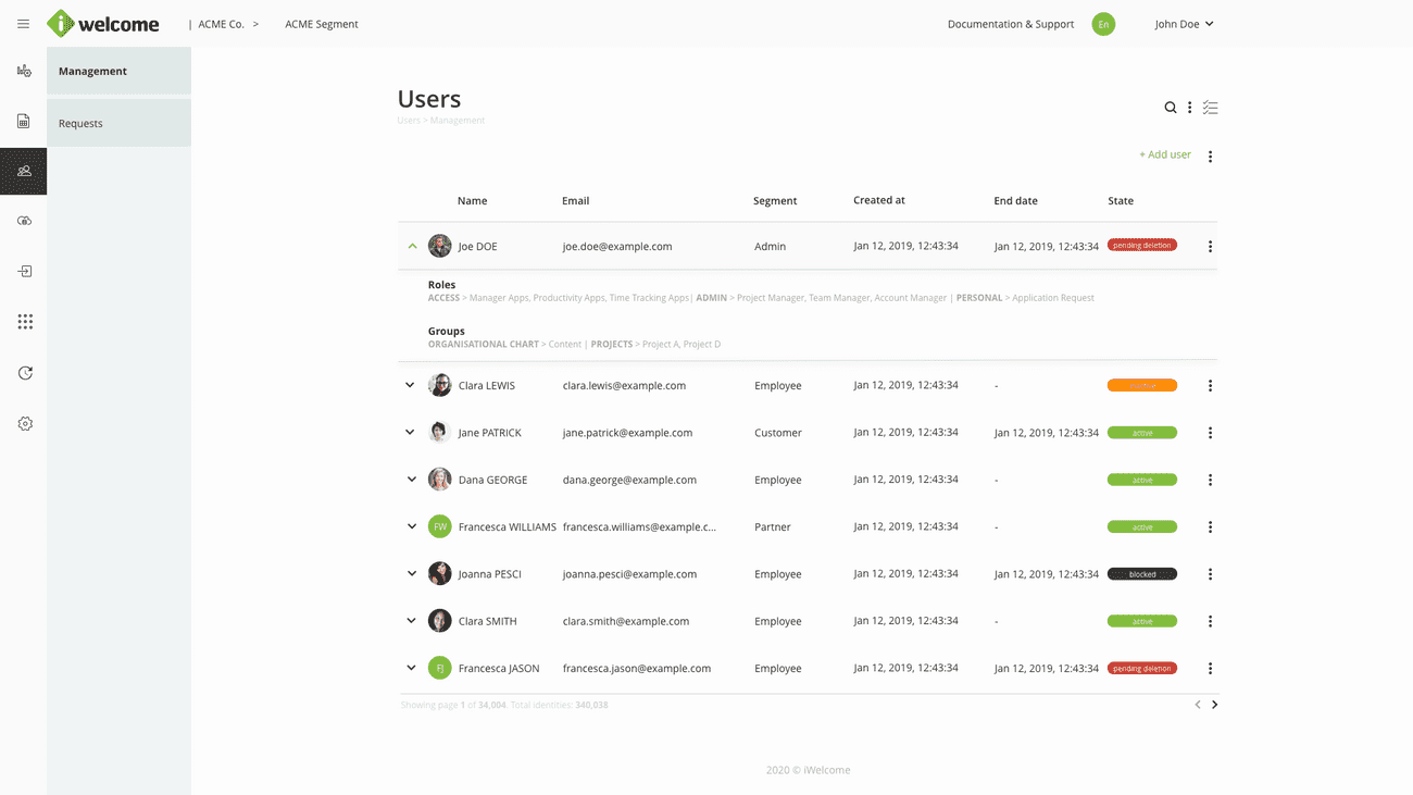 A user is only able to access the Management menu item within the platform if that user has at least one Admin role that grants him that permission. Furthermore, users are only able to manage the identities belonging to the groups thet are allowed to manage, as configured in their admin roles. Therefore, user actions for each managed identity may difer based on the admin role entitlements.