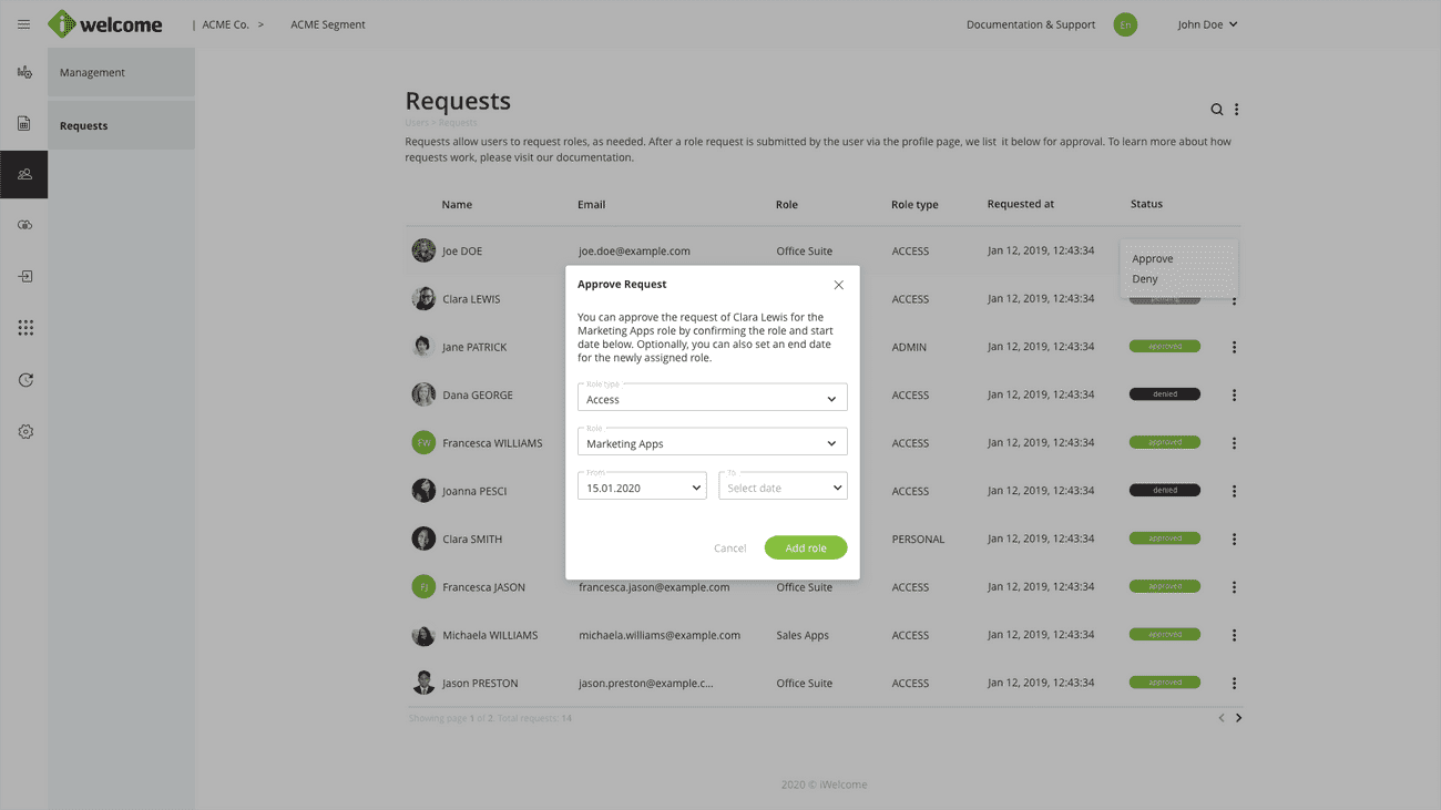 - Approve. If you choose to approve a request, you'll need to confirm the role you are assigning to the user and choose a start date and optionally an end date to that role.
