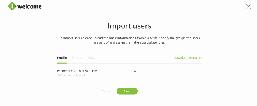 To import users, you first need to download the template we created and populate it with a list of users. Upload the file.