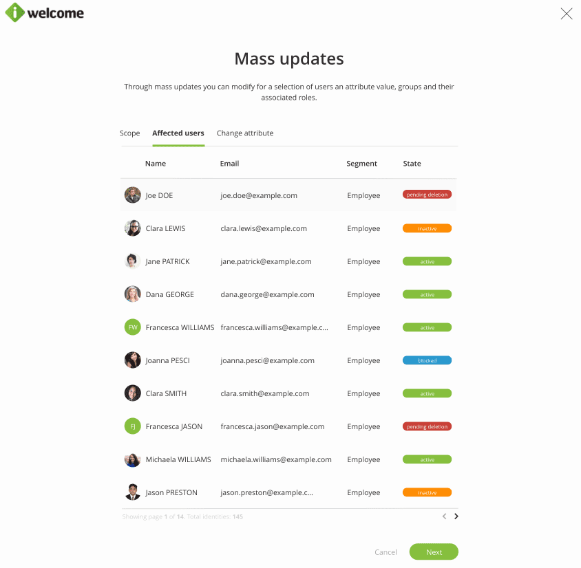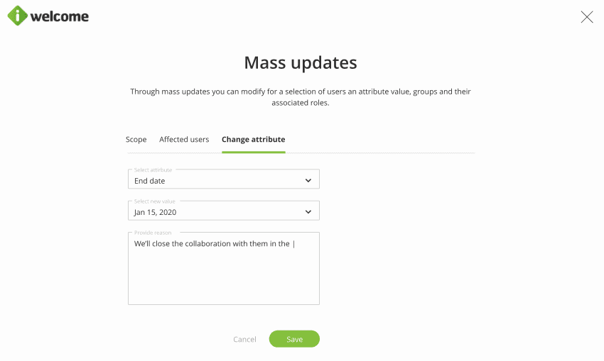 Another tool for performing mass actions on a large number of users are mass updates. You can perform mass updates such as role, group or attribute value changes.