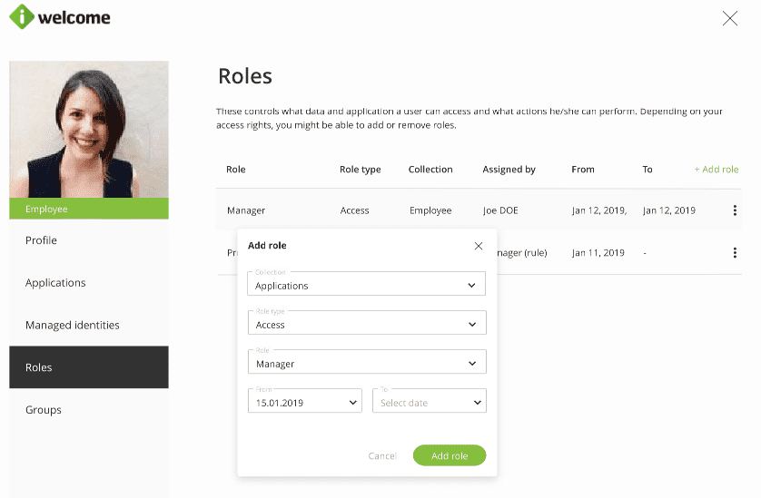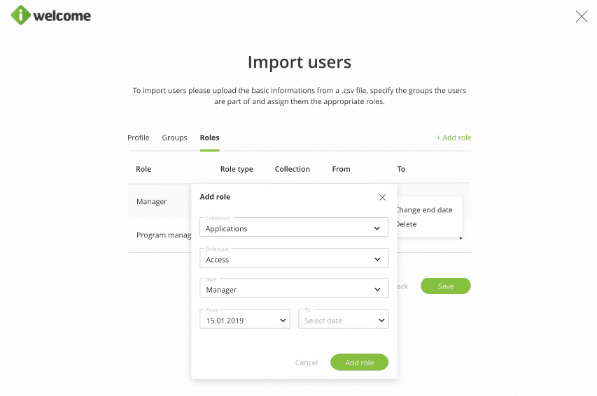 - Management of user roles, including the assignation of time-based roles. Assign user roles, controlling what data and applications a user can access and what actions he can perform. Optionally, you can set up an end date as well.