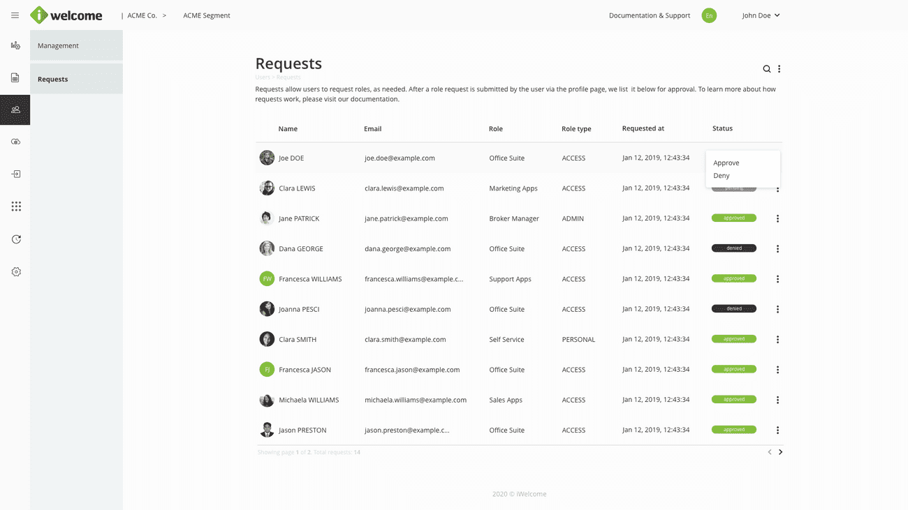 The Requests tab is where we gather all role requests submitted by users, together with information about the user who submitted the request, the role name and type he is requesting access to, the date it was submitted and the request's state.