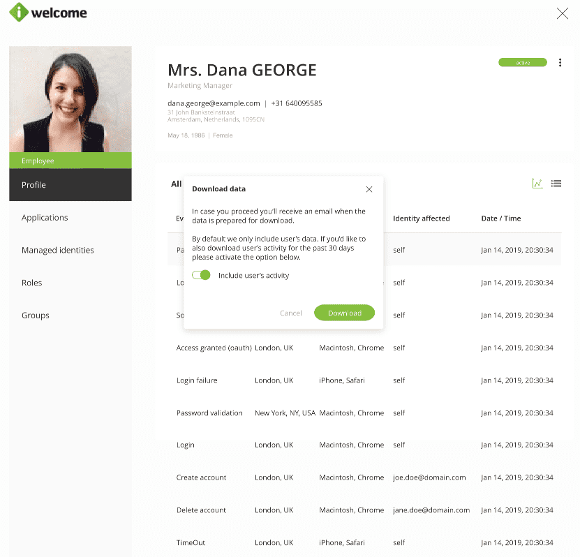 - User data download. Download all personal information related to a user. Optionally, you can include his activity for the past 30 days as well.