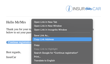 and token from the email, right-click the Continue registration button and copy the link address. You need to capture the processToken