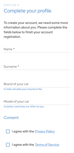 - In the InsurCar registration flow, the registration_selection_step expects the user to specify the following information:
